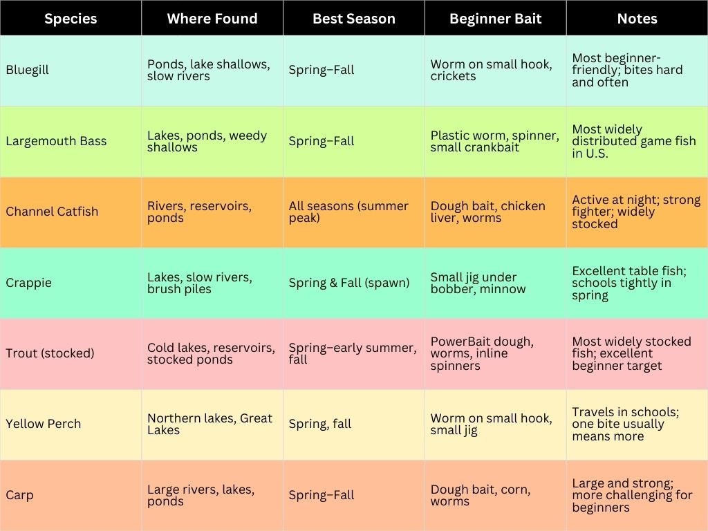 •Winter (below 50°F): Slowest season for most beginner-friendly species. Fish slow down metabolically and feed less frequently. Catfish in deep holes remain catchable with fresh bait. Trout fishing in tailwaters below dams can be excellent. In Southern states, winter fishing remains productive much longer than Northern states.