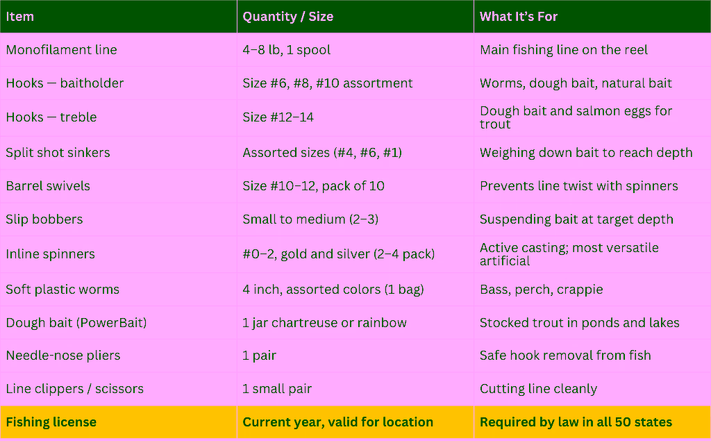 A complete starter tackle kit doesn’t require a massive investment. The items below cover virtually every beginner fishing scenario — stocked pond trout with dough bait, panfish and bass with worms, crappie under a bobber, and active casting with spinners. Many of these are available as bundled starter kits from Eagle Claw, South Bend, or similar brands.